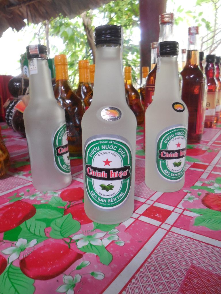 I got in a conversation with the only English speaking people on the bus, a couple from England. A fireman and policewoman. They told me that they did so many tours already, that they decided to do this tour without the Floating Markets. Huh!? I thought this was the one with the floating markets? I checked it with the guide and indeed. This tour didn’t include the floating markets. I regretted really, because that was my sole reason to go on this tour. The guide called with the hotel back and forth. Came out that I was put on the wrong tour, through an error at the reception. Damn!! I still tried to enjoy the tour, but was far from happy. However we sailed the Mekong Delta and rode horse and carriage. A lot of the Vietnamese people wanted to go on the picture with me. And a little Vietnamese boy functioned as translater between me and his family. Turned out that he had learned some English at school. His family members would talk to him in Vietnamese and then push him to translate it to me. “Do you like it here?”, he asked. “Yes, I do”, I replied. “My mom and sister, say they want to sit in the same boat as you.” “O… Kay…”, I replied. Hahaha. It was funny though. The whole boat trip the little guy kept asking me questions. “What is your favorite color?” “What is your favorite music?” “What is your favorite food?” and just when I thought he was finished he asked “Ok and now ask me?” Hahaha! We fed alligators, holding a piece of meat as bate on a wooden fishing rod. To get there we had to walk over a provisionally constructed bridge made out of bamboo. I went cycling through an native village. I learned about water coconuts. I even bought a little bottle of snake wine. Yes, there is an actual snake in the bottle. I had to taste it. It has a real strong taste to it.