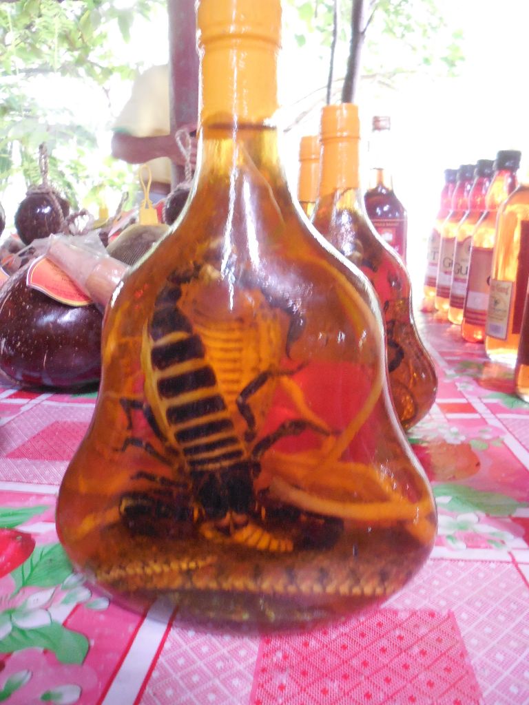 I got in a conversation with the only English speaking people on the bus, a couple from England. A fireman and policewoman. They told me that they did so many tours already, that they decided to do this tour without the Floating Markets. Huh!? I thought this was the one with the floating markets? I checked it with the guide and indeed. This tour didn’t include the floating markets. I regretted really, because that was my sole reason to go on this tour. The guide called with the hotel back and forth. Came out that I was put on the wrong tour, through an error at the reception. Damn!! I still tried to enjoy the tour, but was far from happy. However we sailed the Mekong Delta and rode horse and carriage. A lot of the Vietnamese people wanted to go on the picture with me. And a little Vietnamese boy functioned as translater between me and his family. Turned out that he had learned some English at school. His family members would talk to him in Vietnamese and then push him to translate it to me. “Do you like it here?”, he asked. “Yes, I do”, I replied. “My mom and sister, say they want to sit in the same boat as you.” “O… Kay…”, I replied. Hahaha. It was funny though. The whole boat trip the little guy kept asking me questions. “What is your favorite color?” “What is your favorite music?” “What is your favorite food?” and just when I thought he was finished he asked “Ok and now ask me?” Hahaha! We fed alligators, holding a piece of meat as bate on a wooden fishing rod. To get there we had to walk over a provisionally constructed bridge made out of bamboo. I went cycling through an native village. I learned about water coconuts. I even bought a little bottle of snake wine. Yes, there is an actual snake in the bottle. I had to taste it. It has a real strong taste to it.