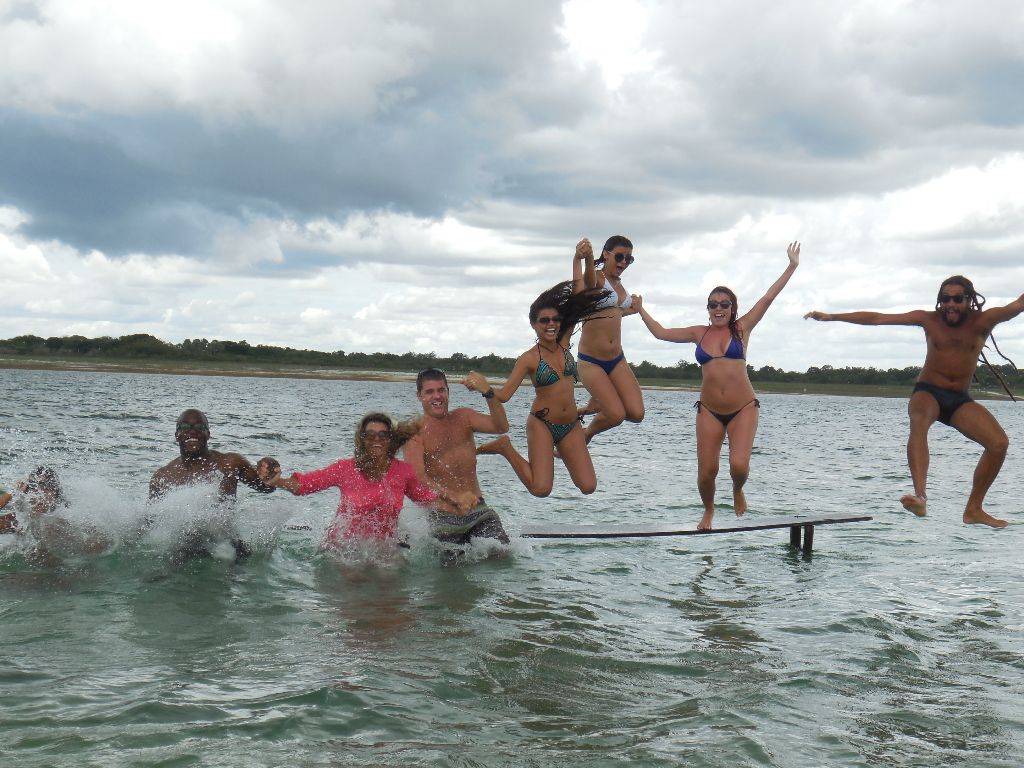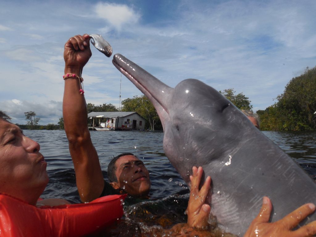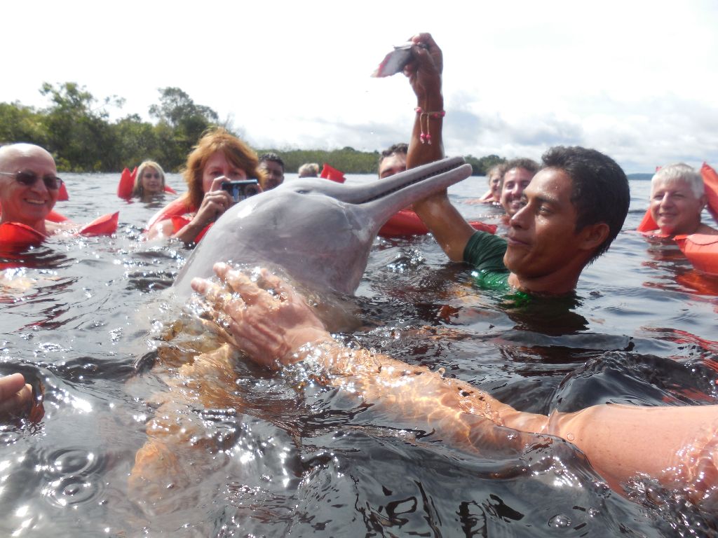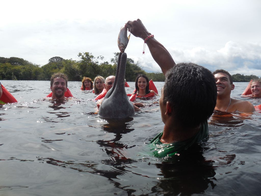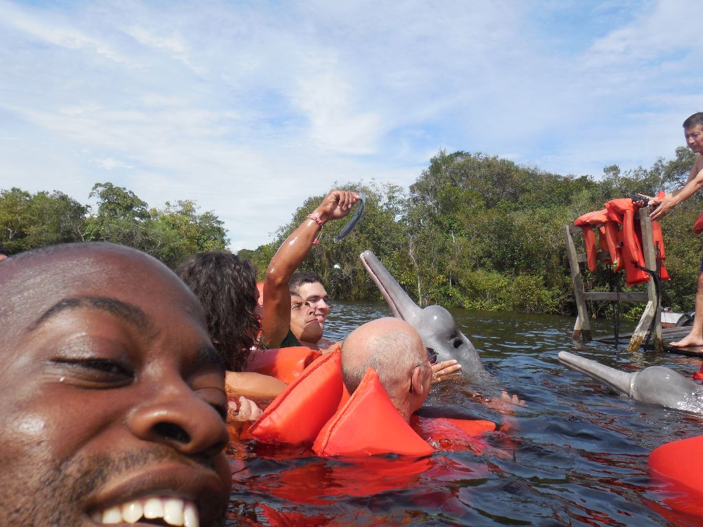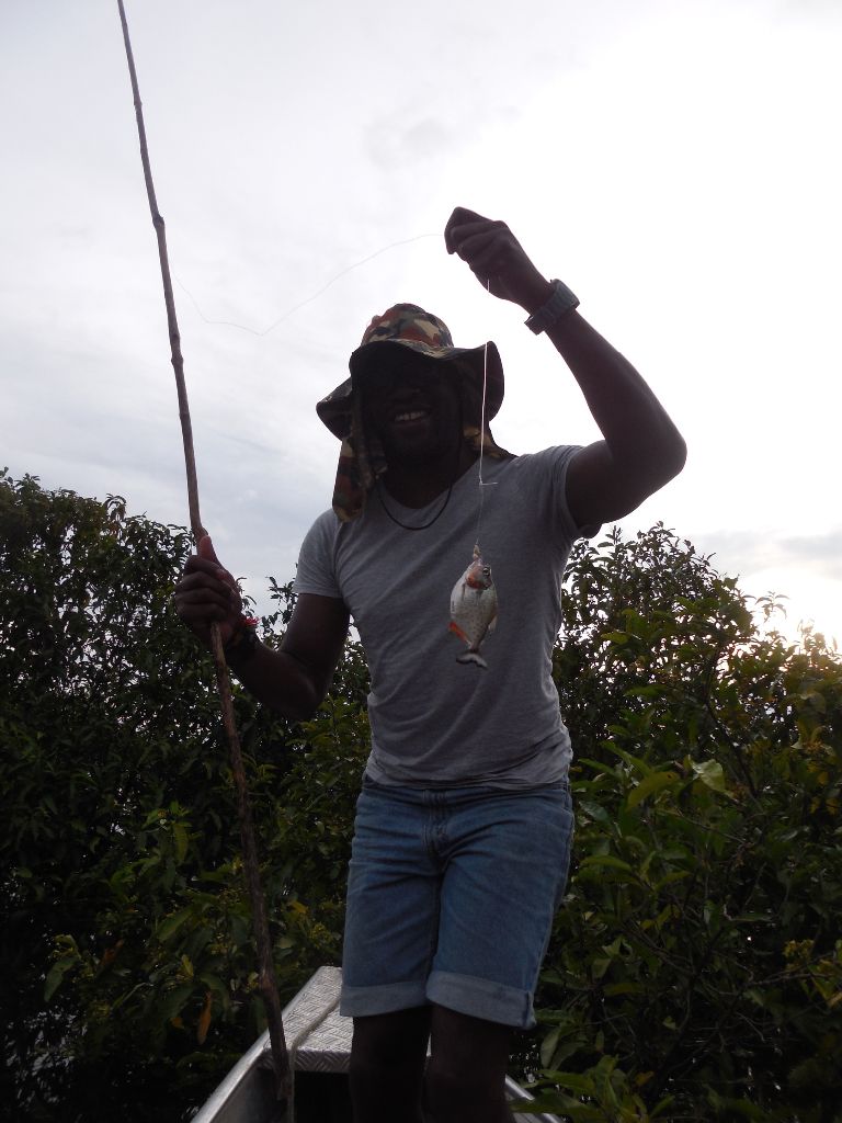 The first thing on our list: Fishing for Piranha’s. We went on a small motorized fishermen’s boat with about six people and a guide. We had simple fishing rods made of branches and used chicken as bate! Hahaha. We went to the first spot. No luck. The guide told us about the piranha’s. He showed us a missing part of his finger, due to a Piranha encounter. Then we went to the second spot. The guide told us, that actually Piranha’s were not that vicious as people think. You can even have a swim with them, unless you don’t bleed. Because if one Piranha bites you and you start to bleed, that’s like honey to the rest of the flock. You will not survive. When we went on our way to the third spot, my hope of catching a piranha was affected. There was also a couple on the boat. The guy was a professional fisher. And while he was talking about his fishing experience someone yelled: “Whoaaah, I feel something bite!” From that moment we knew they were here. We waited, and waited. I put on fresh new piece of chicken on my hook. And then suddenly the fisherman’s girlfriend caught the first piranha!! We saw it and it was quite big. The guide helt the piranha and put a wooden stick between the fish’s teeth. Snap! Before you knew it his jaws clipped the stick like it was nothing. Now everybody was driven to catch a Piranha too. We waited, waited and again!!! The fishermen’s girlfriend caught another piranha. We started to make jokes about she being the real fishermen of the two. It was funny, but after she caught her fourth one in a row, the fisherman was not laughing at all. Then one of the others caught one. After that it was my turn. I felt something nibbling at my hook and BAM there it was! A piranha fresh on my hook. Also while we were fishing wild dolphins visited us. They even came pretty close to the boat, jumping playfully. Beautiful! Eventually the fisherman caught one piranha too, but a meager result compared to the seven piranha’s his girlfriend had caught at the end of the day.