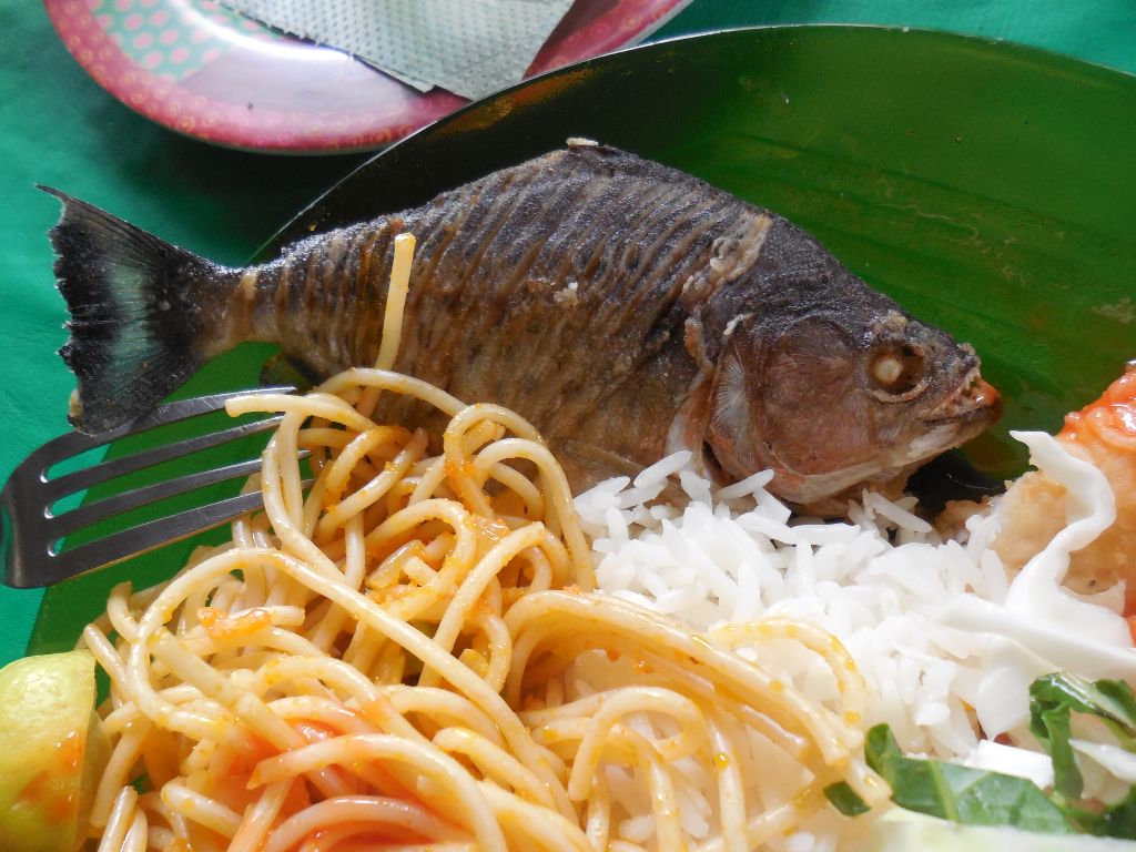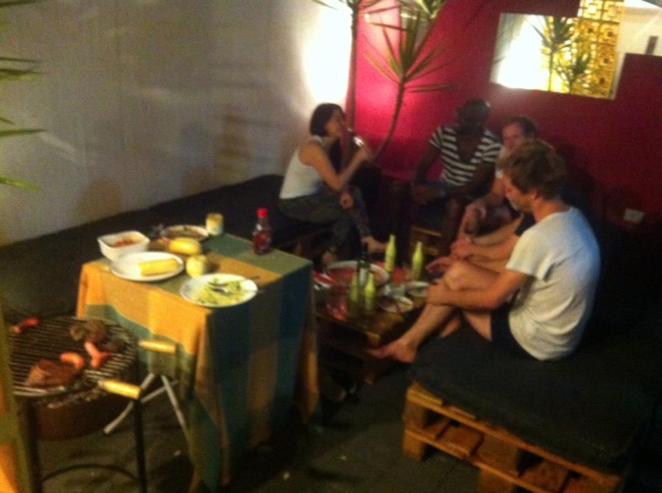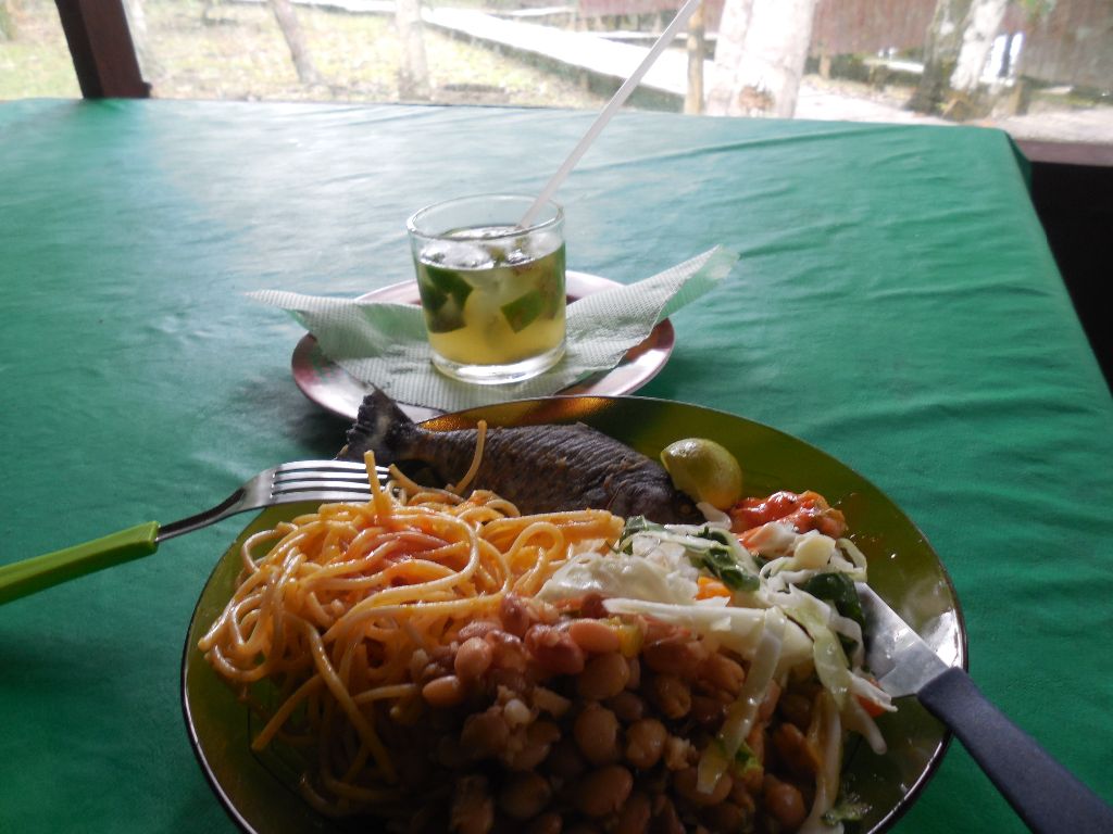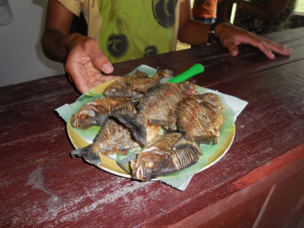 The next day we got up early to go in to the forest. The guide told us a lot about the forest. We saw cashew nuts, which are actually poisoned fruits until you bake them. We saw cacao and ate it right of the tree. It does not taste anything like the chocolate it eventually becomes. It has actually a real fruitlike taste. Tucan birds flying above our heads as we got a taste of the Brazilian nut. The shell which contains the nuts can only be opened with a machete. The guide took the shell with him, to open it up for us later. We saw cotton which are flowers in the tree and pineapples growing above the ground. Then suddenly we came across an old lady with a machete. She was one of the indegious people. The guide lent her machete and opened the Brazilian nut. It tasted really good! We also saw rubber trees. The guide told us about the history of the rubber tree, which only grew in Brazil and gave much wealth to Manaus. He was surprised that I added to his story, the fact that an English man stole the seed of the tree to plant it in Malaysia and India, thus taking away the monopoly position of Manaus. This eventually turned out to be catastrophic for the Manaus economy. He laught: “I was going to tell that, but there are English people here.” Hahaha. On our way back I had a talk with the guy who controlled our boat. He was born in the Amazon. Through him I really understand how well they are at reading their environment. For example he swims amongst big caimans, but only at day time. At day time they are not hungry, because they hunt and feed at night time. He also told me how they catch the caimans. The trick is to point your flashlight in the water and look for the reflection of the caimans eyes. Then look at the distance between the eyes to see if it’s a small one. If so, get near and just grab it by the neck. Also he explained how lakes form nodes and rivers connect these nodes. That’s how they find their way across the rivers. His house is build on pillars to protect it from a flood, but also to keep out insects. And finally they hold chickens who kill all the bugs for them. It all actually sounds pretty logic when you here it like this. When we arrived back at the lodges, they served us the piranha’s we caught the day before. Awesome! I was already wondering why we didn’t put them back in to the river. ;-)