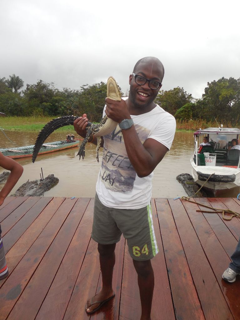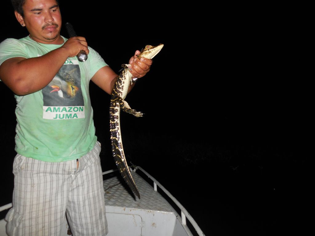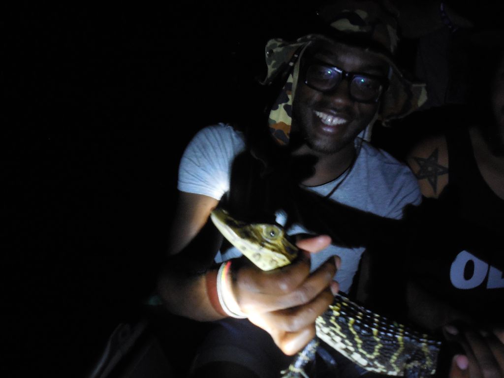 We came back at our lodges by dusk to eat and drink something. We ate, something, played domino’s and had some Caipharina’s. Night was falling and everyone was talking about what we were going to do the next day. But as it is a fact that most creatures come out at night, we were surprised by the guide.. “We are going to look for caimans in the river. Now!” Slightly overwhelmed we got in to a small boat. Knowing the night had fallen and all the animals are out, it felt like National Geographic in real life! This is were I realized again where I was. Crazy! The water was just a few centimeters below the edge of the small boat. It felt like a large caiman could easily get in. We sailed across the river. The other guide stood on the tip of the boat like a rambo, pointing his flashlight at the grass of the river bank. We joked a bit about him: “Oh, yeah and now he will catch a caiman from the water with his bear hands hahaha” Then suddenly he went flat on his belly, put his hand in the water and actually caught one! We were in shock! He freaking did it! It was not a large one, it was a baby black & white caiman and these babies can grow to 6 meters. Caimans have no taste or smell, they will eat everything!