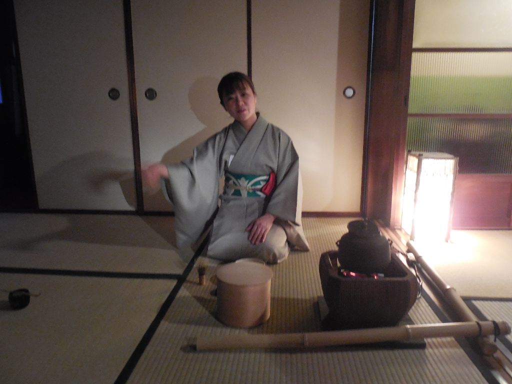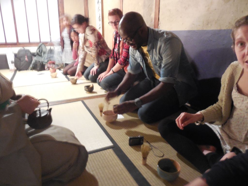 I also attended a traditional tea ceremony. We were introduced in to the art and history of the tea ceremony then the woman performed the tea ceremony, which was a range of delicate actions. Taking a spoon, putting the spoon back, taking some tea, mixing it with water, cleaning the spoon, putting the water back etc. etc. I had walked all day and was a bit tired, so this was really relaxing, almost meditating to look at. Later on we learned that every action has a meaning. For example before you drink your tea, you look at the cup. This is to admire the artwork on the cup. Then you turn the cup 180 degrees, so the artwork faces away from you. This is not to besmirch the artwork with your lips and to let the other people in the room also admire the artwork on your cup. After you finished drinking you again turn the cup 180 degrees, so you can admire the artwork again. Each and every action has a meaning like this. The ceremony took about half an hour. After she finished we had a cup of green tea. She explained that this was only the short, basic version. Normally a ceremony takes like three hours. Three hours for a cup of tea… really!? It is beautiful and I like the symbolism around it, but I don’t know if I could wait three hours for a cup of green tea. Hahaha The tea was delicious however! In the beginning she explained that one of the principles of the ceremony is tranquility. Later on she explained that one cup of green tea holds more caffeine than a cup of coffee. I couldn’t help but asking how these two work together, because it sounded a bit contradictory. She answered: “We are good at surpressing our feelings, it is typical to Japanese culture” I was like wow, best answer ever!