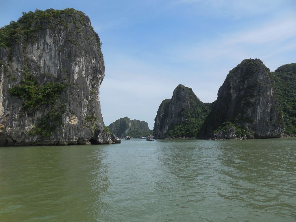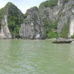 The next day I did a day trip to the famous Ha Long Bay which was one of the main things I wanted to see in Vietnam. On the bus I met an Indonesian couple who travel the world a lot. The guy was saying that he travelled almost the whole world etc. etc. I have an iPad app that let’s you fill in the countries you have been through and calculate the percentage of the world you have travelled. I invited him to fill in his countries. He was shocked to find out that he had only travelled 14% (which is still a lot). After that the conversation changed to more real life personal subjects. Hahaha After a two hour bus ride we finally arrived at Ha Long. There we took the boot. On the boot we had a great lunch. I sat at the table with the couple and three girls from Singapore we had just met. We talked about both the countries and also my experiences there. The woman of the couple had a conversation with one of the girls in their mother language. This seemed pretty normal, until I realized that the girl was from Singapore and the woman from Indonesia. Curiously I asked how they could understand each other. They explained me that they speak Malay in Singapore and that the Indonesian language originated from Malay, so the two languages are so similar that they can understand each other for 80% or so. Amazing! But the thing I found even more Amazing were the rocks that were suddenly entering my view. We were there Ha Long Bay!!!