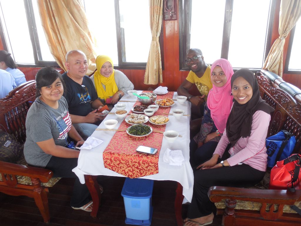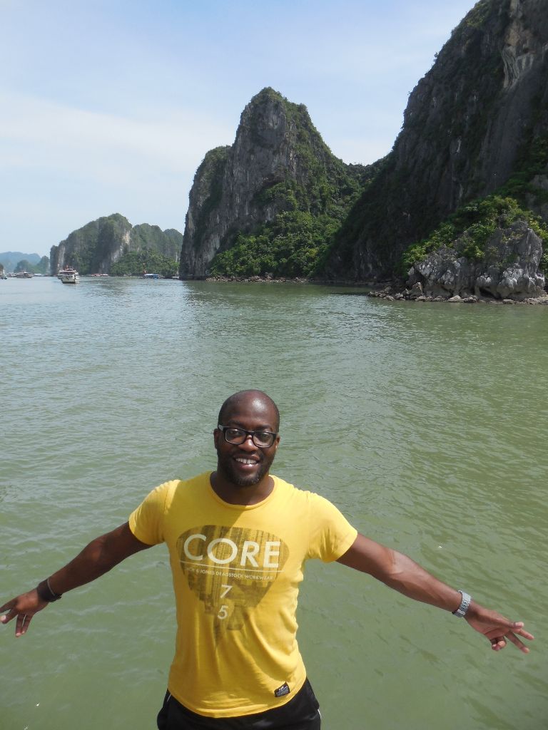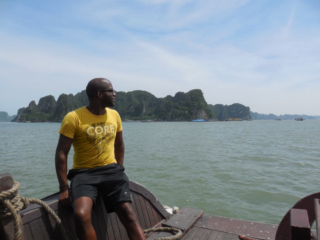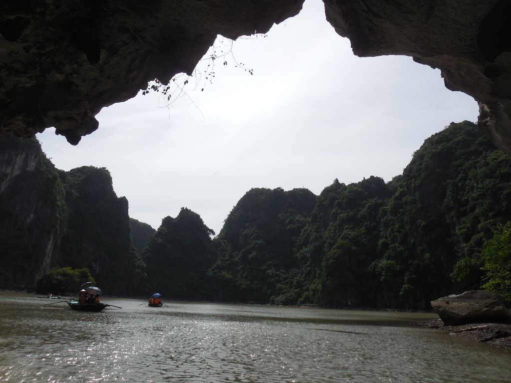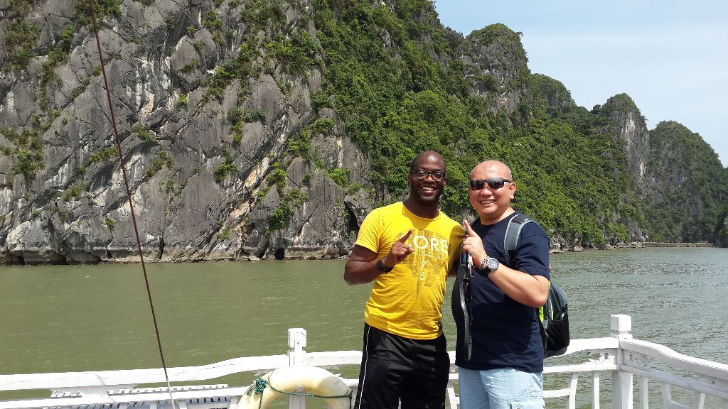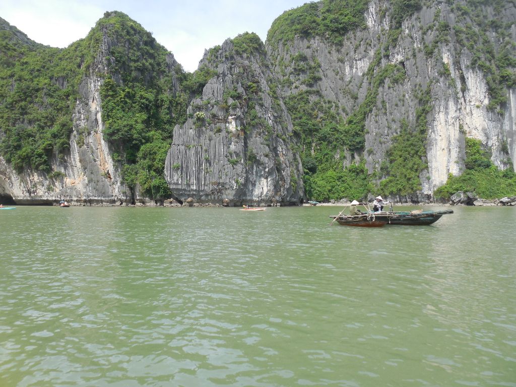 The next day I did a day trip to the famous Ha Long Bay which was one of the main things I wanted to see in Vietnam. On the bus I met an Indonesian couple who travel the world a lot. The guy was saying that he travelled almost the whole world etc. etc. I have an iPad app that let’s you fill in the countries you have been through and calculate the percentage of the world you have travelled. I invited him to fill in his countries. He was shocked to find out that he had only travelled 14% (which is still a lot). After that the conversation changed to more real life personal subjects. Hahaha After a two hour bus ride we finally arrived at Ha Long. There we took the boot. On the boot we had a great lunch. I sat at the table with the couple and three girls from Singapore we had just met. We talked about both the countries and also my experiences there. The woman of the couple had a conversation with one of the girls in their mother language. This seemed pretty normal, until I realized that the girl was from Singapore and the woman from Indonesia. Curiously I asked how they could understand each other. They explained me that they speak Malay in Singapore and that the Indonesian language originated from Malay, so the two languages are so similar that they can understand each other for 80% or so. Amazing! But the thing I found even more Amazing were the rocks that were suddenly entering my view. We were there Ha Long Bay!!!